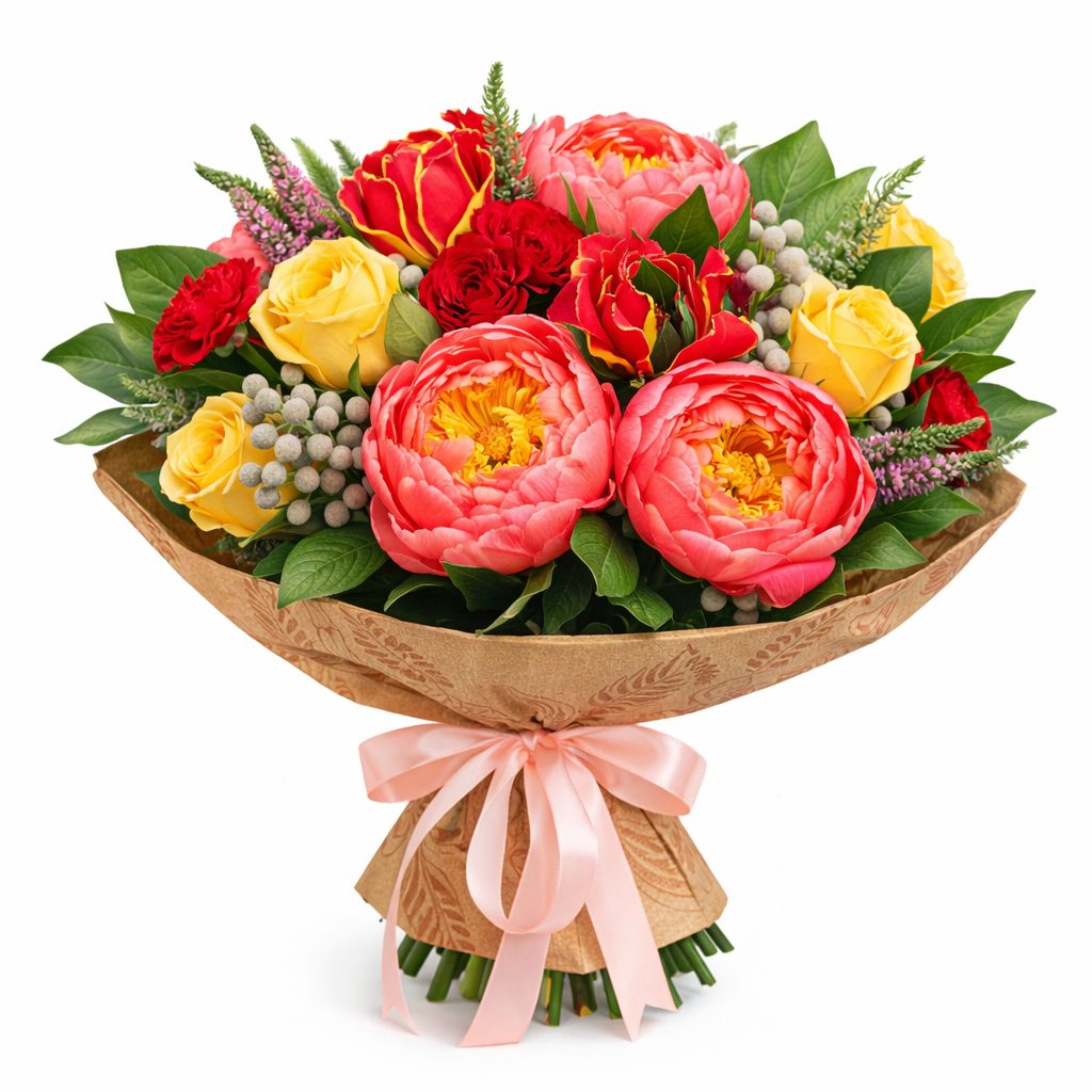 Пион коралловый, роза кустовая чайная, целозия гребенчатая, бруния и вероника создают яркий и динамичный ансамбль. Букет оформлен в крафт-бумагу и перевязан нежной розовой лентой. Для разнообразия можно выбрать упаковку из матовой плёнки или декоративной сетки. Прекрасный выбор для поздравления на день рождения или для любимой женщины.