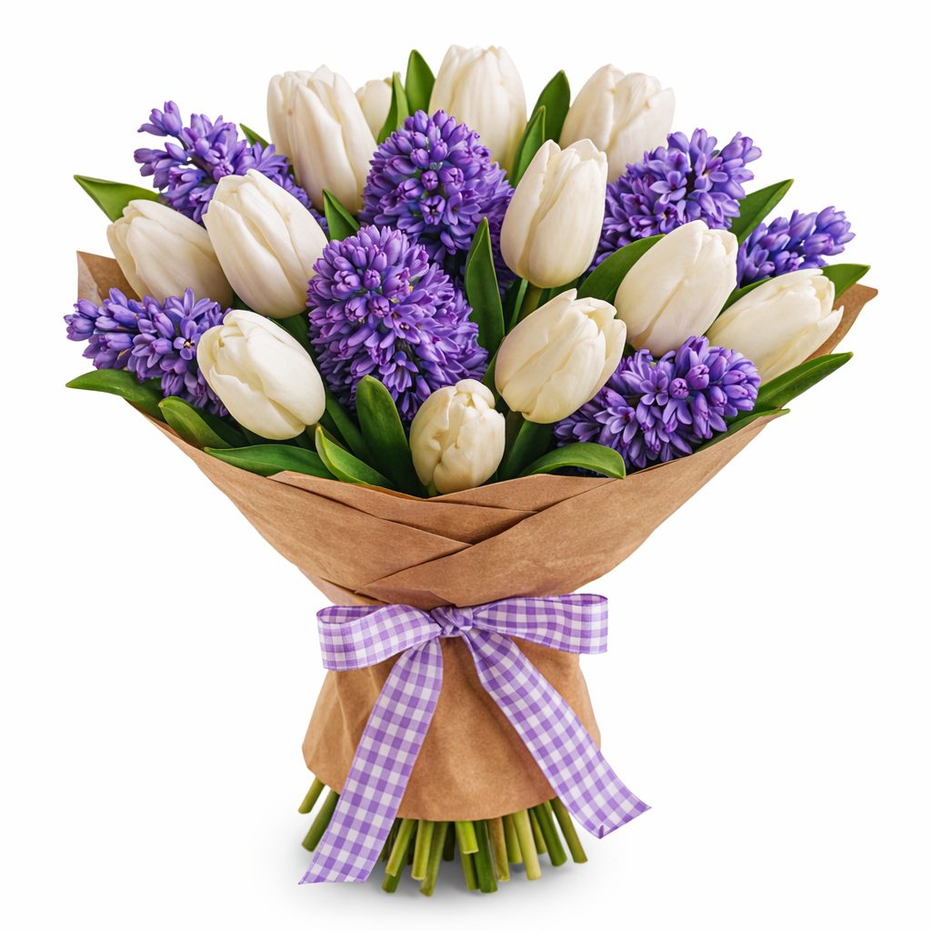 Белоснежные тюльпаны и синие гиацинты создают изысканную композицию, напоминающую о свежести весны. Букет оформлен в крафт-бумагу и перевязан лентой в клетку, что придаёт ему особую элегантность. Возможны альтернативы упаковки: матовая плёнка или декоративная сетка. Прекрасный выбор для подарка на 8 марта или для любимой.