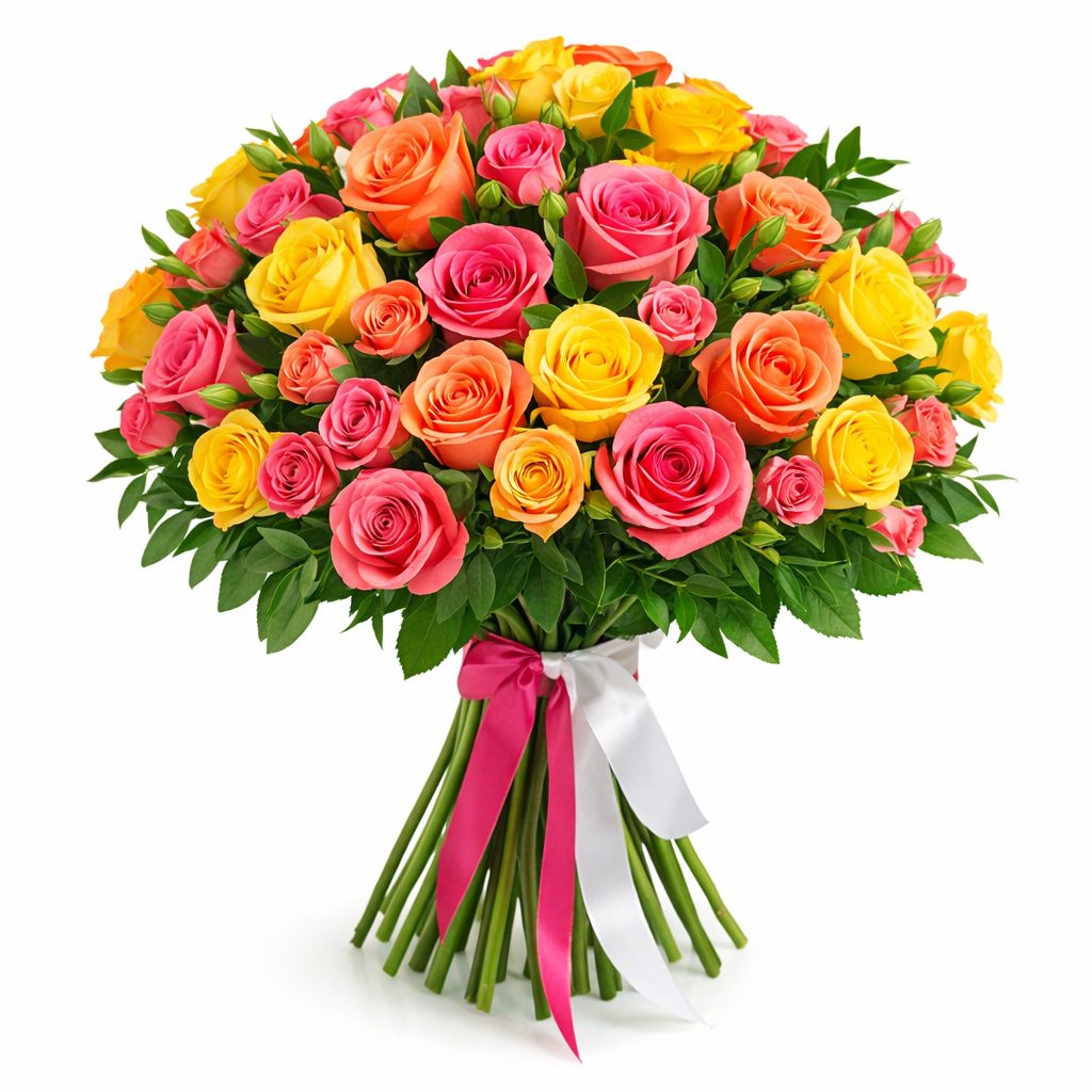 Яркий букет из одноголовых роз, розовых кустовых роз и фисташки создаёт атмосферу праздника. Перевязан атласной розовой и белой лентой. Возможна упаковка в крафт-бумагу или декоративную сетку. Прекрасный подарок для жены на годовщину или для мамы на день рождения.