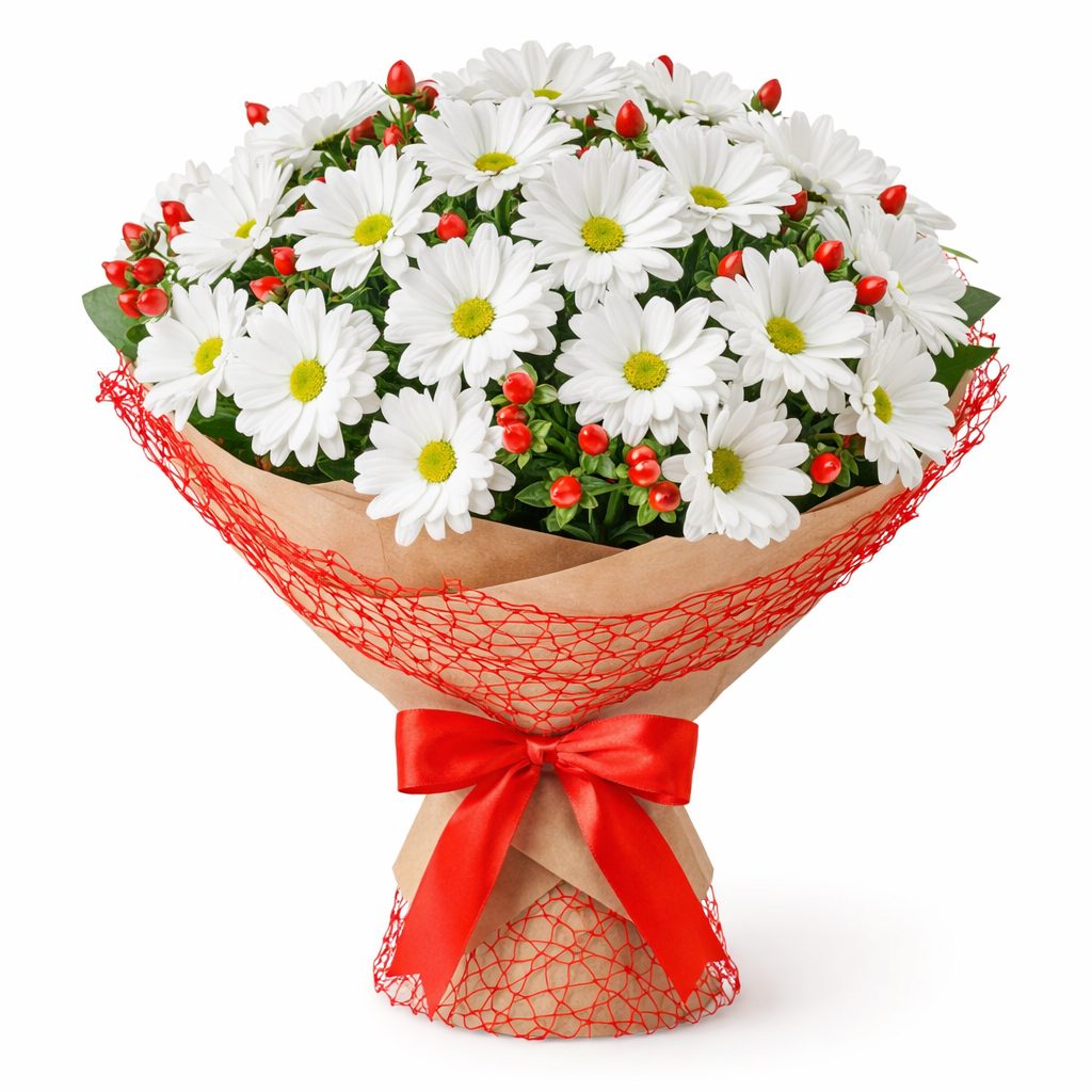 Белоснежные кустовые хризантемы и яркий гиперикум создают гармоничное сочетание в этом букете. Упакован в матовую плёнку, сетку и перевязан лентой, подчёркивающей его элегантность. Возможны альтернативы с атласной лентой или крафт-бумагой. Прекрасный выбор для подарка на день рождения для мамы или подруги.