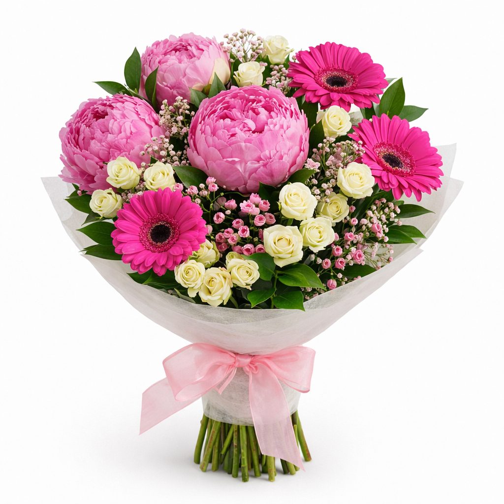 Розовые пионы и герберы, белые кустовые розы, ваксфлауэр и гипсофила создают нежную и романтичную композицию. Букет перевязан атласной лентой и обернут в матовую пленку, что подчеркивает его изысканность. Возможны альтернативы упаковки: крафт-бумага или декоративная сетка. Прекрасный выбор для любимой на день рождения или годовщину.