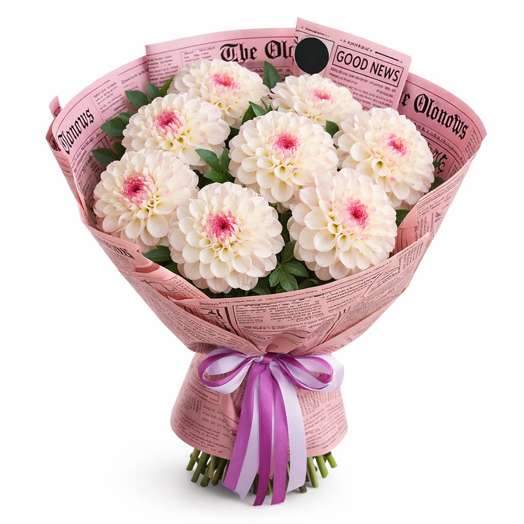 Белоснежные георгины с нежным розовым оттенком создают атмосферу утренней свежести, дополненной зеленью эвкалипта и изысканным аспарагусом. Букет оформлен в стильную матовую плёнку с газетным принтом и перевязан атласной лентой. Возможны варианты упаковки с декоративной сеткой или фетром. Прекрасный подарок для любимой на день рождения или годовщину.