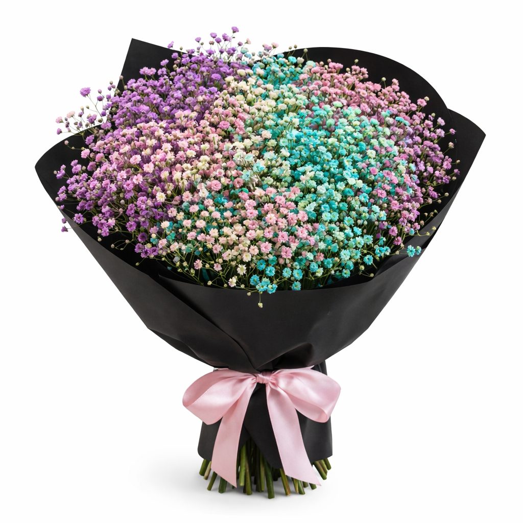 Гипсофила в белых, жёлтых, розовых, сиреневых и голубых оттенках создаёт нежное облако изящества. Букет оформлен в матовую плёнку и перевязан розовой атласной лентой. Возможны альтернативы упаковки: крафт-бумага или декоративная сетка. Прекрасный выбор для подарка на день рождения для любимой.