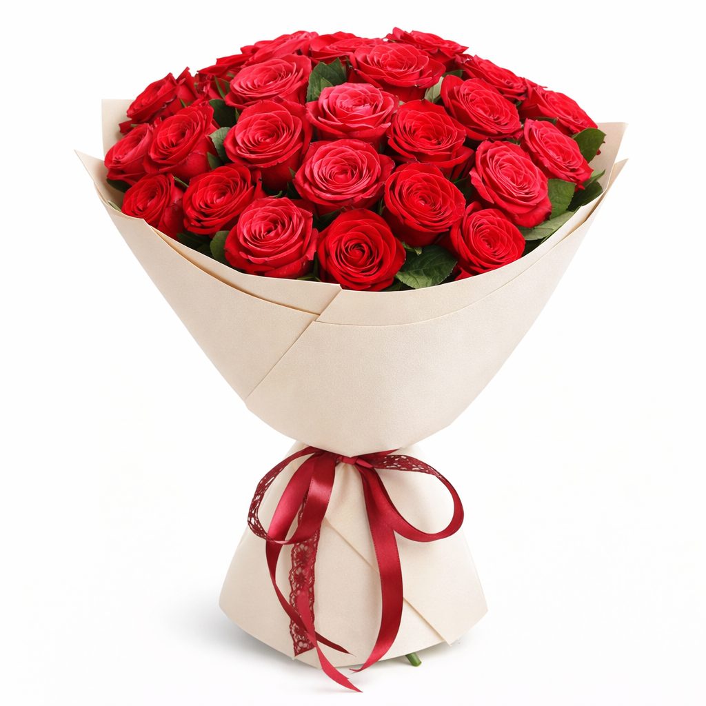 Роскошные красно-розовые одноголовые розы создают атмосферу утренней свежести и нежности. Букет оформлен в элегантную матовую плёнку, перевязанную изысканной красной лентой. В качестве альтернативы можно выбрать крафт-бумагу или декоративную сетку. Прекрасный выбор для любимой на годовщину или день рождения.
