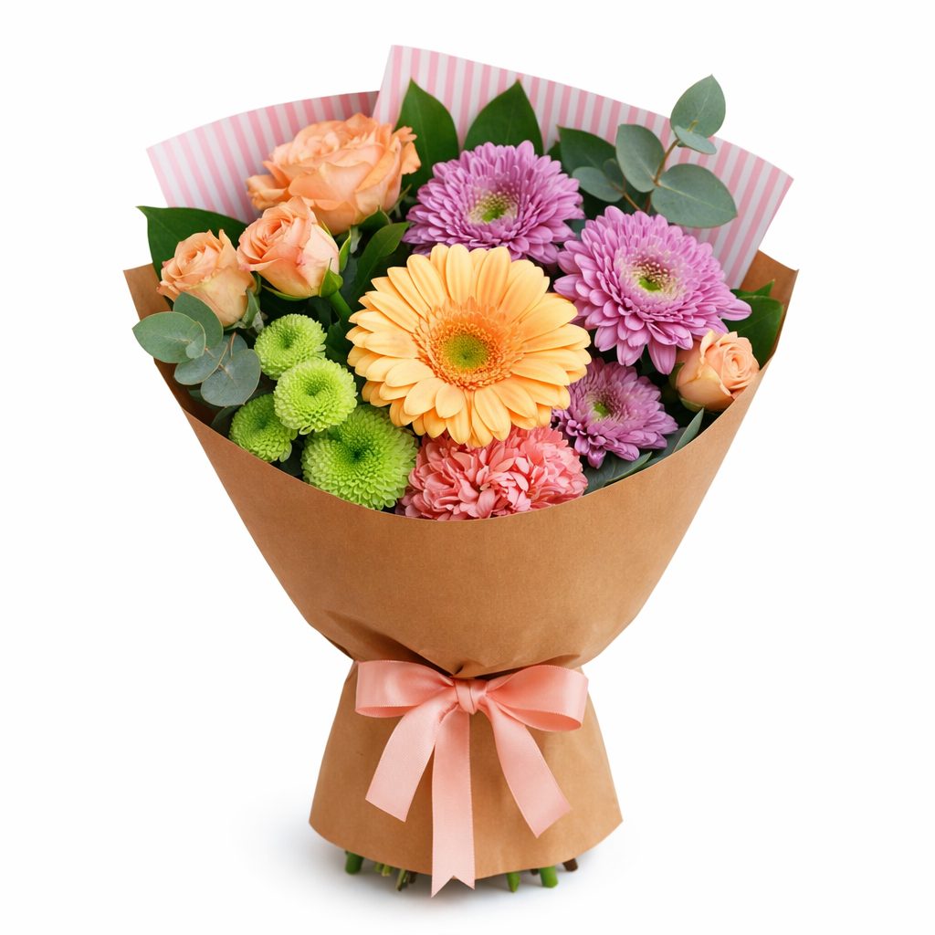 Кремовая гербера, зеленая и сиреневая хризантема кустовая, розовая гвоздика, кустовая роза и эвкалипт создают гармоничную композицию. Букет оформлен в крафт-бумагу и перевязан нежной розовой лентой. Альтернативно можно использовать матовую плёнку или декоративную сетку. Подходит для подарка на день рождения для любимой.