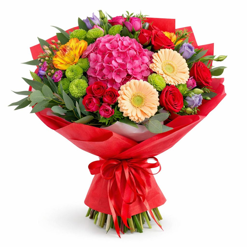 Яркое сочетание розовой гортензии, кремовых гербер и розовых кустовых роз создаёт атмосферу нежности и утончённости. Альстромерии и эустомы добавляют изысканности, а мини-хризантемы и эвкалипт придают свежесть и объём. Букет оформлен в красно-розовую матовую плёнку и перевязан яркой лентой. Альтернативные варианты упаковки: атласная лента или крафт-бумага. Прекрасный выбор для подарка на день рождения для любимой или мамы.