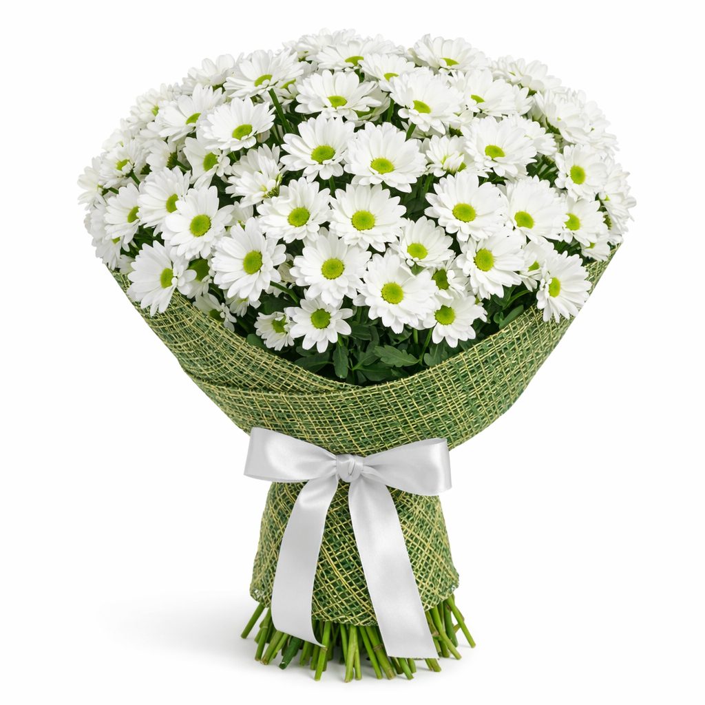 Белоснежные кустовые хризантемы создают атмосферу чистоты и свежести. Букет оформлен в декоративную сетку и перевязан атласной лентой. Возможны варианты упаковки с матовой плёнкой или крафт-бумагой. Прекрасный выбор для поздравления на День матери или для любимой.