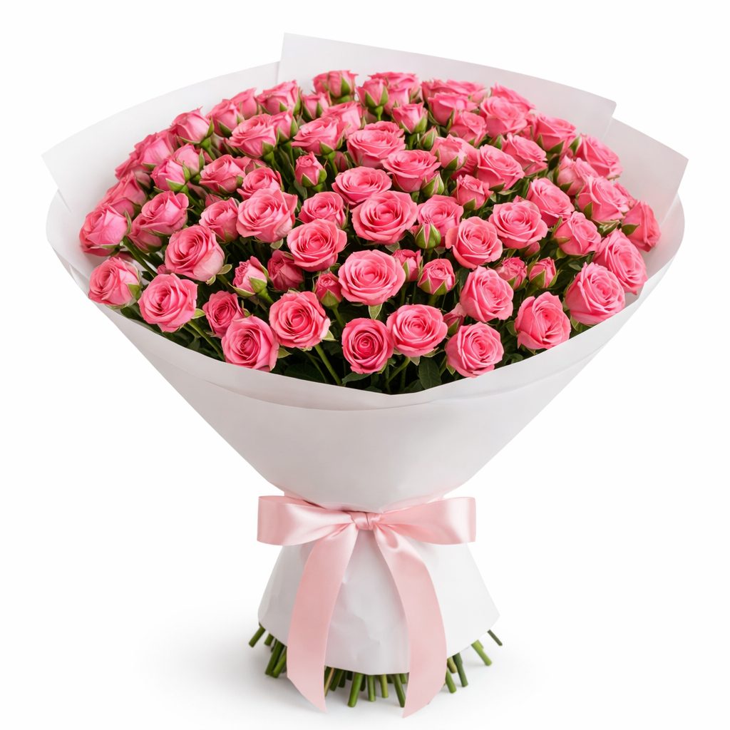 Розовые кустовые розы создают атмосферу нежности и романтики. Букет оформлен в матовую плёнку и перевязан атласной лентой розового цвета. Возможны варианты упаковки с крафт-бумагой или декоративной сеткой. Прекрасный подарок для любимой на день рождения или годовщину.