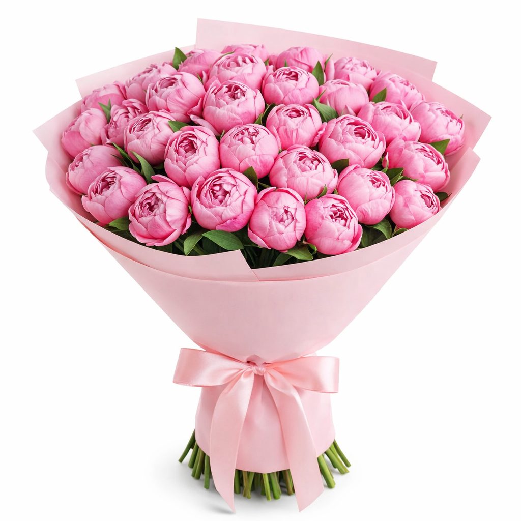 Роскошные розовые пионы создают нежное облако, подчёркивая изысканность и утонченность композиции. Букет перевязан атласной лентой и дополнен матовой плёнкой, что придаёт ему особую элегантность. Возможны альтернативы упаковки: крафт-бумага или декоративная сетка. Прекрасный подарок для любимой на день рождения или годовщину.