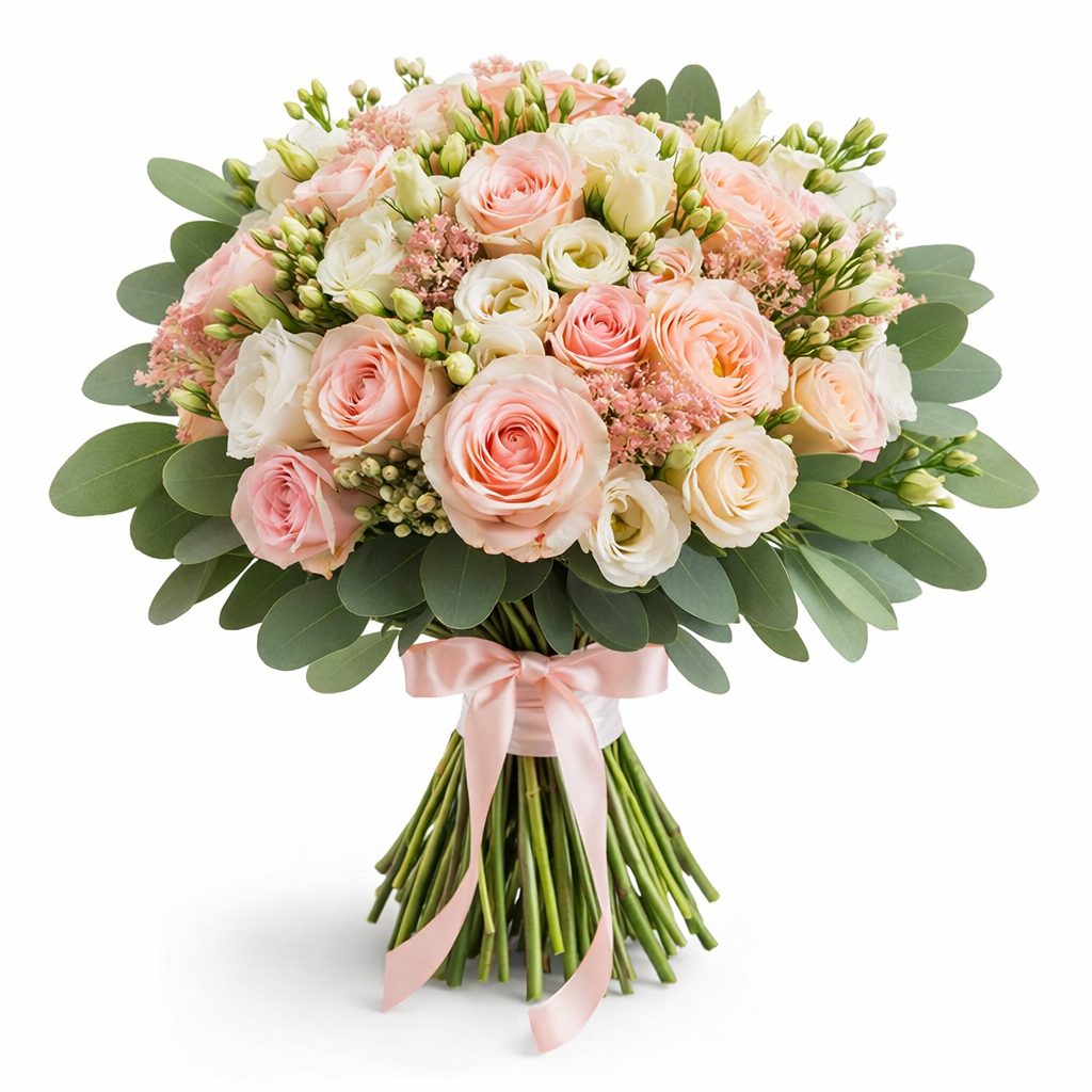 Розовые одноголовые розы и нежные эустомы в сочетании с белыми фрезиями и зеленью создают утончённую композицию. Букет перевязан розовой атласной лентой, придающей ему элегантность. Возможна упаковка в крафт-бумагу или матовую плёнку. Прекрасный выбор для любимой на день рождения или годовщину.
