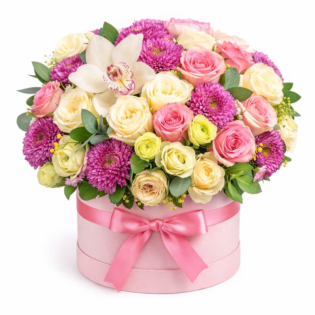 Эта изысканная композиция сочетает в себе белоснежные орхидеи, кремовые розы и сиреневые астры, создавая атмосферу нежности и утончённости. Бело-зелёные эустомы и гипсофила добавляют свежести, а эвкалипт и декоративная бабочка придают особый шарм. Композиция оформлена в элегантной шляпной коробке ярко-красного цвета. Возможны варианты оформления в бархатной или атласной коробке. Прекрасный подарок для любимой на годовщину или день рождения.