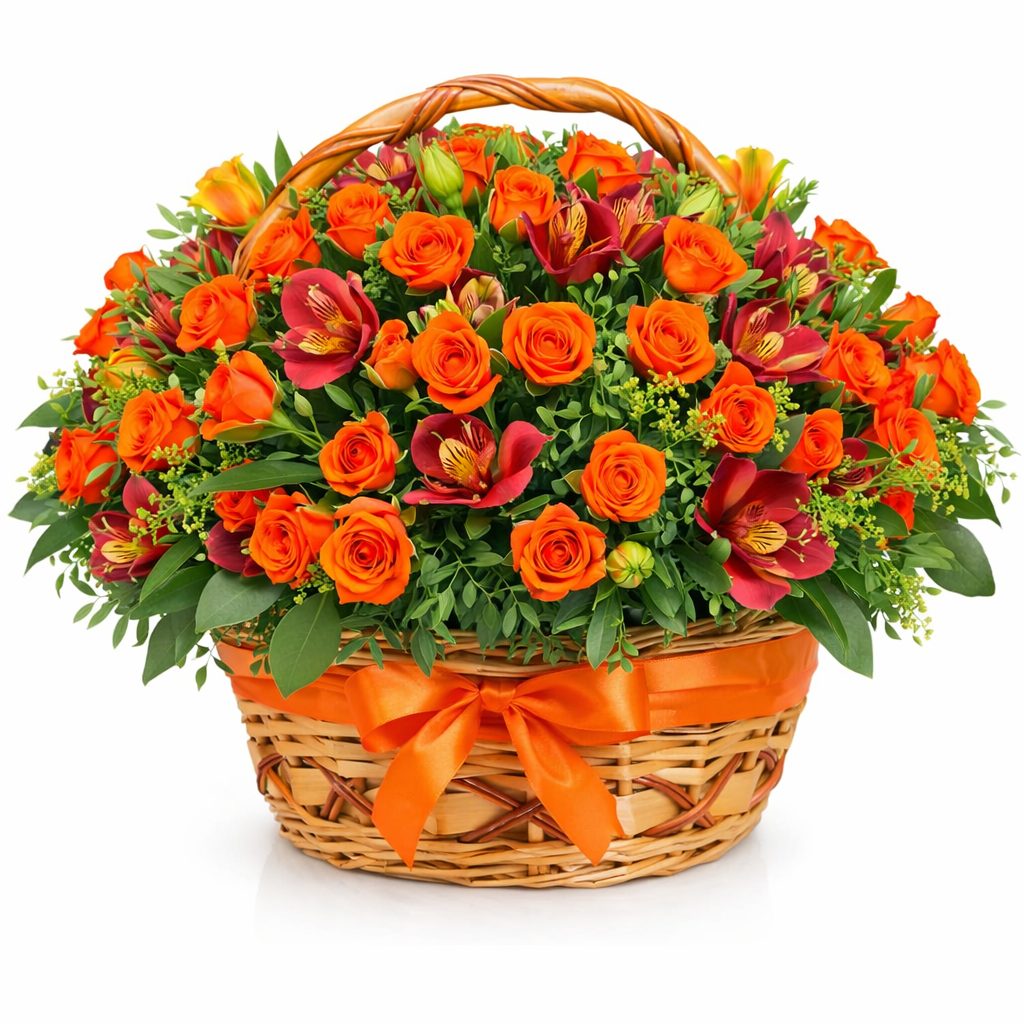 Яркая композиция из оранжевых кустовых роз, красных альстромерий и орхидей, дополненная свежей зеленью, создает атмосферу праздника. Цветы аккуратно размещены в плетёной корзине с оазисом, что обеспечивает их свежесть. Возможна альтернатива оформления в корзине из ротанга или с тканевой отделкой. Прекрасный подарок для жены на годовщину или для мамы на день рождения.