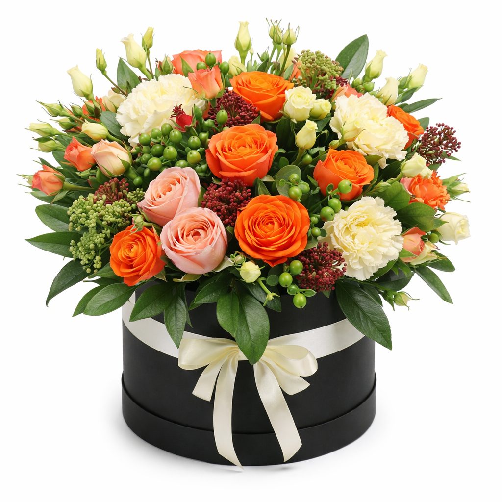 Яркие оранжевые кустовые розы и нежные розовые пионовидные розы создают гармоничное сочетание с кремовыми эустомами и диантусами. Гиперикум и зелень добавляют композиции свежести и объёма. Цветы оформлены в элегантной чёрной шляпной коробке, перевязанной атласной лентой. Возможны альтернативы в бархатной или дизайнерской коробке. Прекрасный подарок для любимой на день рождения или юбилей.