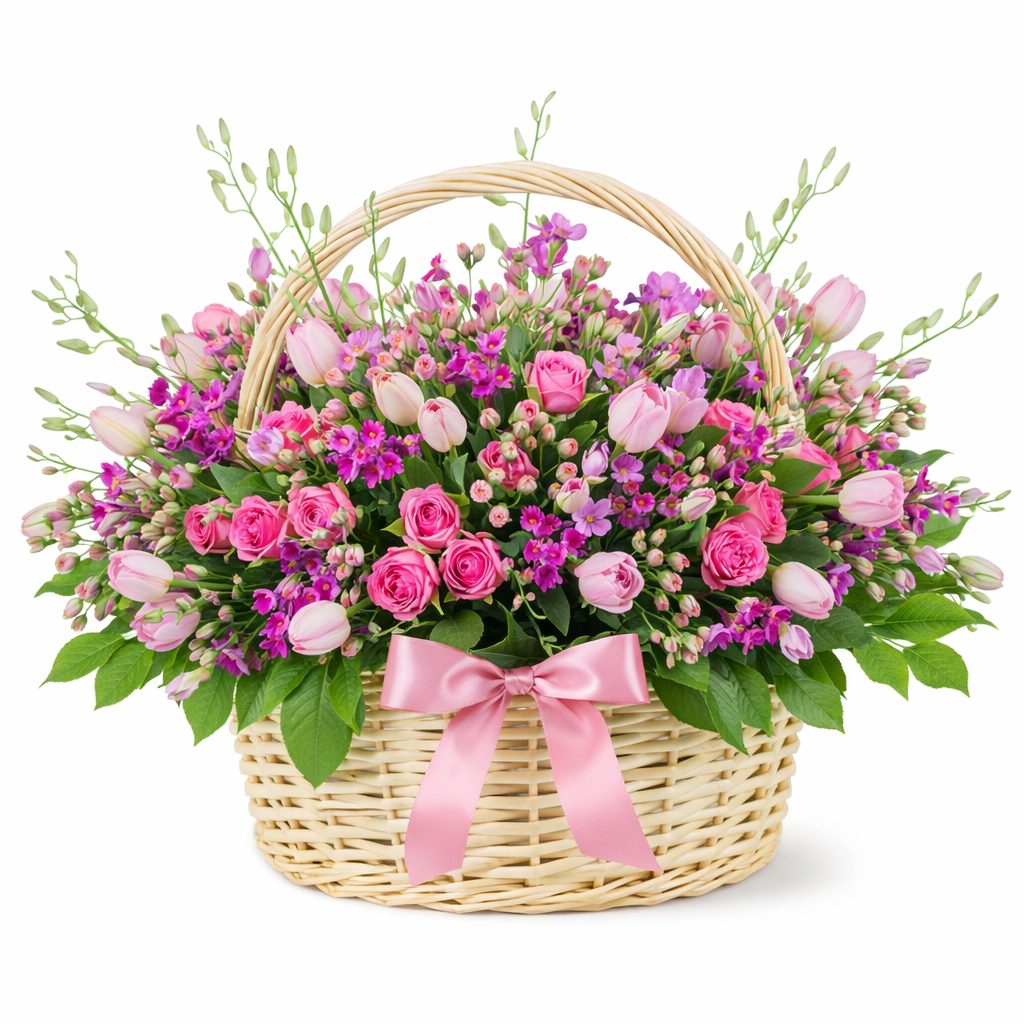 Розовая кустовая роза, нежные тюльпаны и изысканные орхидеи создают гармоничную композицию, дополненную снежноягодником. Корзина из светлого ротанга подчёркивает естественную красоту цветов. Возможны альтернативы: корзина из лозы или с тканевой отделкой. Прекрасный подарок для любимой на годовщину или день рождения.