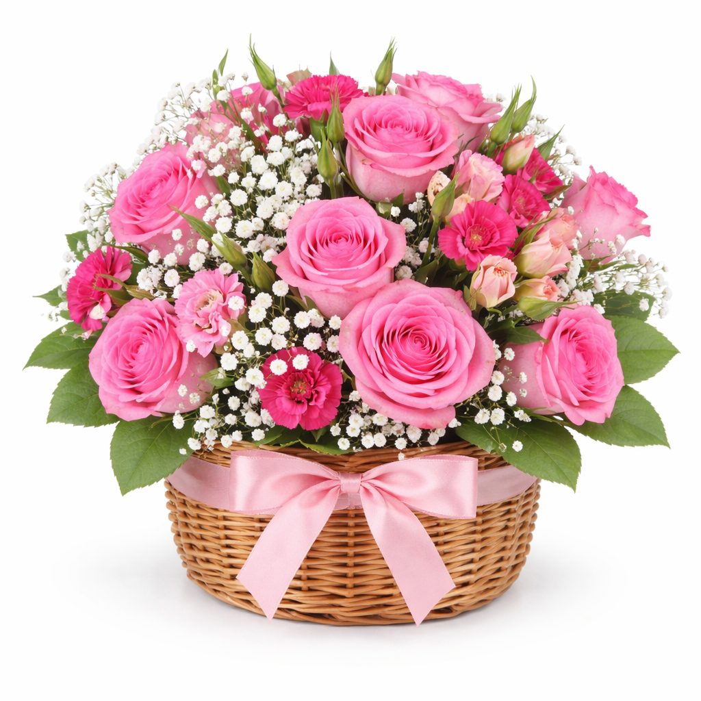 Розовые розы, диантус и альстромерия создают нежное сочетание, дополненное воздушной гипсофилой. Композиция оформлена в плетёной корзине, придающей ей естественный шарм. Возможны альтернативы оформления: корзина из лозы или корзина с тканевой отделкой. Прекрасный подарок для любимой на день рождения или годовщину.