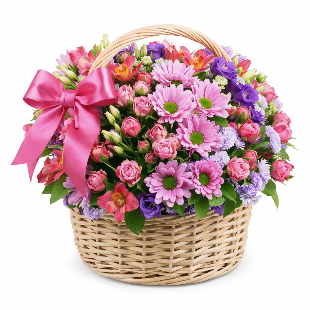 Розовые кустовые хризантемы и альстромерии создают нежную основу этой композиции, дополненную фиолетовыми эустомами и розовыми кустовыми розами. Статица добавляет легкости и воздушности. Корзина из лозы украшена яркой фиолетовой лентой. Возможны варианты оформления в корзине из ротанга или с тканевой отделкой. Прекрасный подарок для мамы на День матери или для подруги на день рождения.
