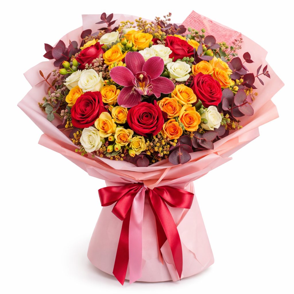 Роскошный букет сочетает в себе розовые орхидеи, жёлтые кустовые розы, розовые одноголовые розы и белые мини-гвоздики, дополненные эвкалиптом. Упакован в матовую плёнку и перевязан атласной лентой. Возможны альтернативы оформления: крафт-бумага или декоративная сетка. Прекрасный выбор для подарка на годовщину или для любимой.