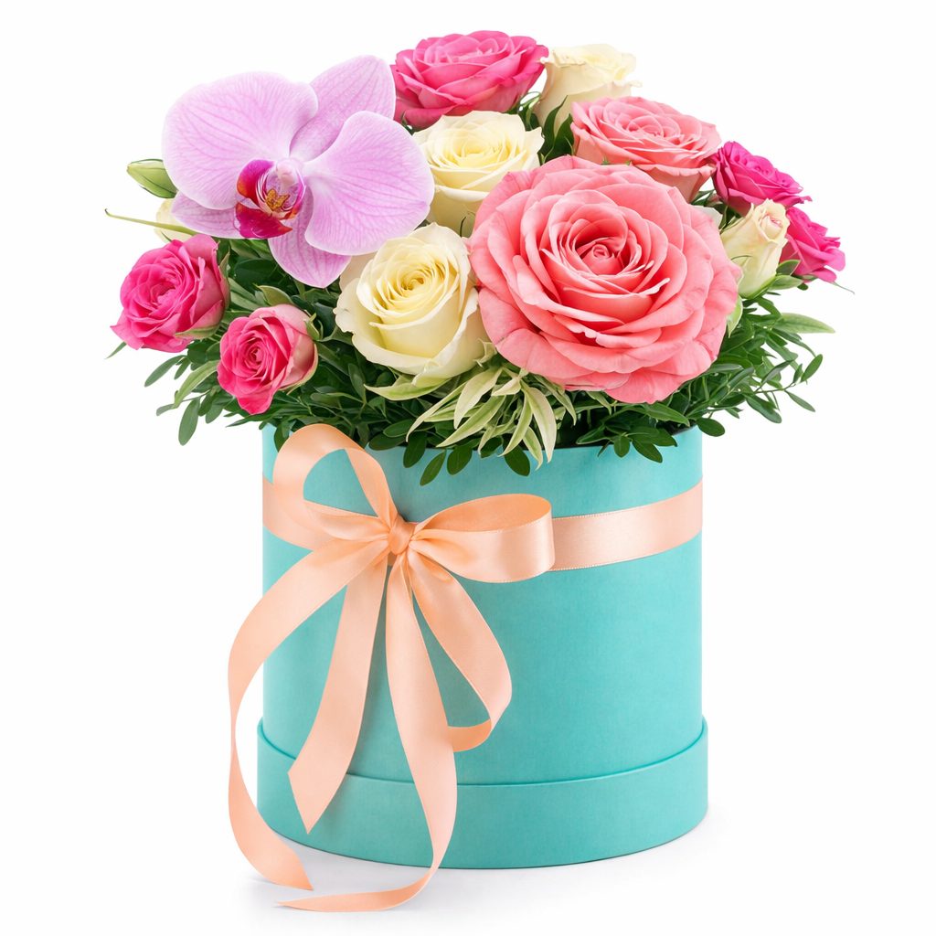 Роскошная композиция из розовых орхидей, одноголовых роз и кустовых роз в кремовых и розовых оттенках, дополненная свежей зеленью, создает атмосферу нежности и утонченности. Цветы расположены в элегантной шляпной коробке бирюзового цвета, перевязанной атласной лентой. Возможны варианты оформления в бархатной или дизайнерской коробке. Прекрасный подарок для любимой на день рождения или годовщину.
