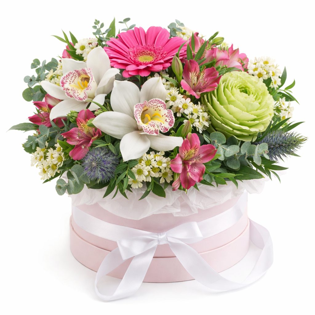 Белоснежные орхидеи и розовые герберы создают яркий акцент в композиции, дополненной декоративной капустой и мини-хризантемами. Альстромерии и эрингиум придают букету изысканность, а эвкалипт добавляет свежести. Композиция оформлена в элегантной шляпной коробке нежно-розового цвета. Возможны варианты оформления в бархатной или атласной коробке. Прекрасный подарок для любимой на годовщину или день рождения.
