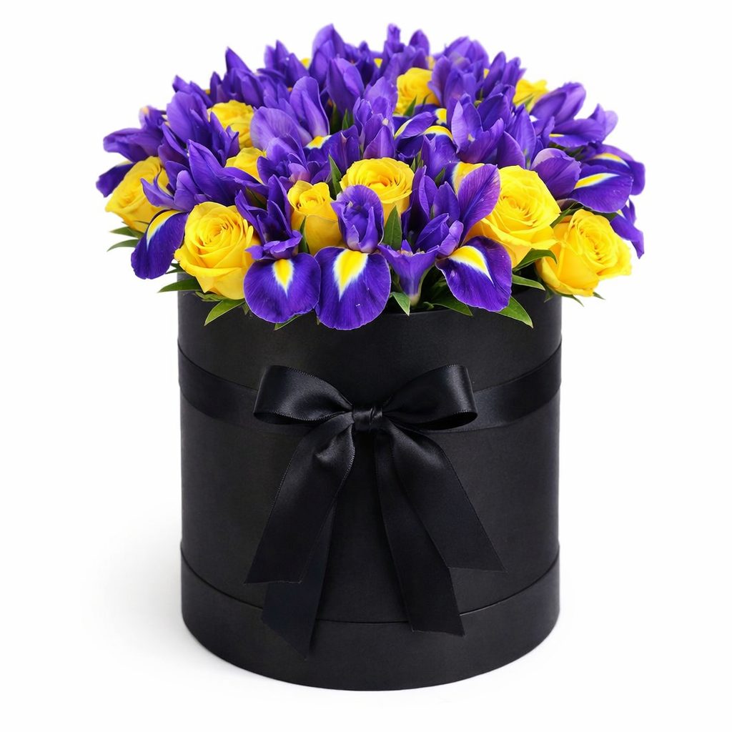 Яркое сочетание фиолетовых ирисов и жёлтых кустовых роз создаёт неповторимую композицию. Цветы расположены в элегантной чёрной шляпной коробке, украшенной контрастной жёлто-синей лентой. Возможны альтернативы оформления в бархатной или атласной коробке. Прекрасный подарок для любимой на 8 марта или день рождения.
