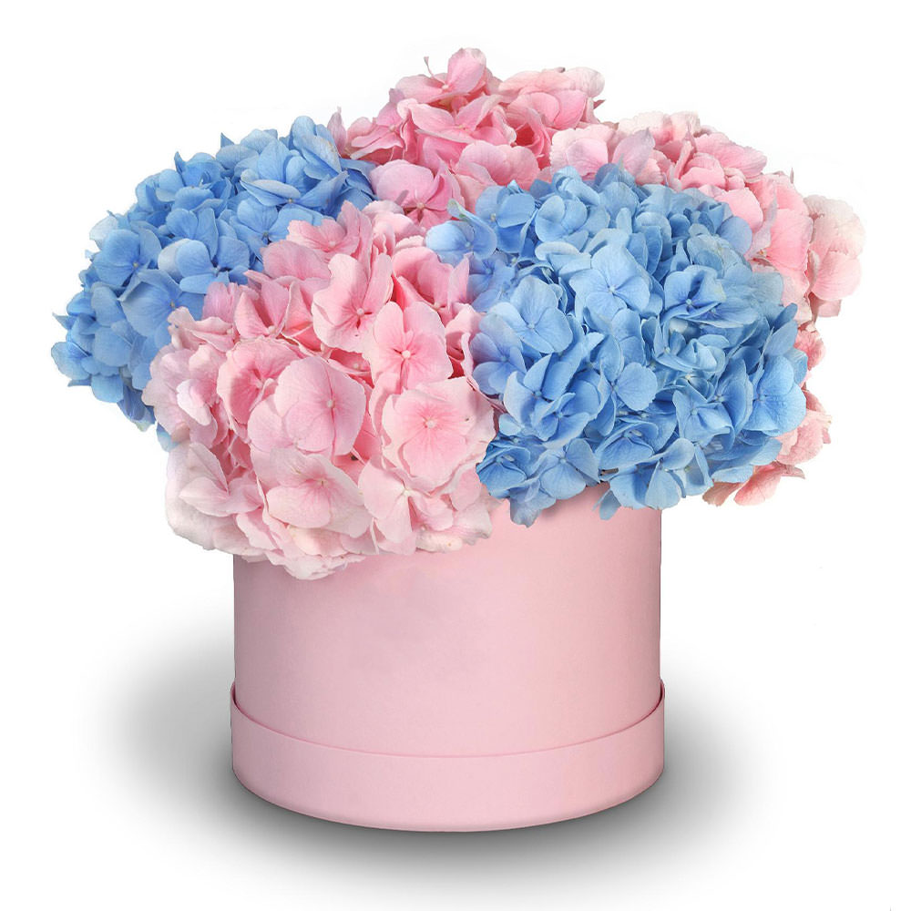 Розовая и голубая гортензия создают нежное сочетание, которое подчеркнет любую обстановку. Цветы расположены в элегантной розовой шляпной коробке, добавляя изысканности. Альтернативные варианты оформления включают бархатную или атласную коробку. Прекрасный подарок для любимой на годовщину или день рождения.