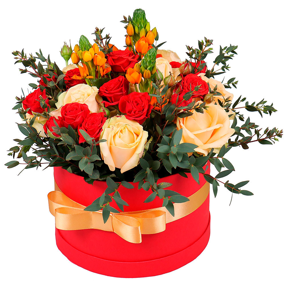 Кремовые одноголовые розы и яркие красные кустовые розы создают эффектный контраст, дополненный оранжевым орнитогалумом и свежим эвкалиптом. Композиция оформлена в красной шляпной коробке с золотистой лентой, придающей ей элегантный вид. Возможны альтернативы оформления: бархатная коробка или атласная коробка. Прекрасный подарок для любимой на годовщину или день рождения.