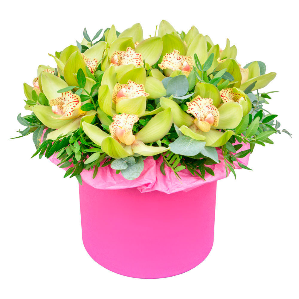 Яркие жёлтые орхидеи в сочетании с нежной фисташкой создают уникальную композицию, которая привлекает внимание и дарит радость. Цветы размещены в стильной шляпной коробке насыщенного розового цвета, что подчеркивает их свежесть и элегантность. Альтернативное оформление возможно в бархатной или дизайнерской коробке. Прекрасный подарок для любимой на 8 марта.
