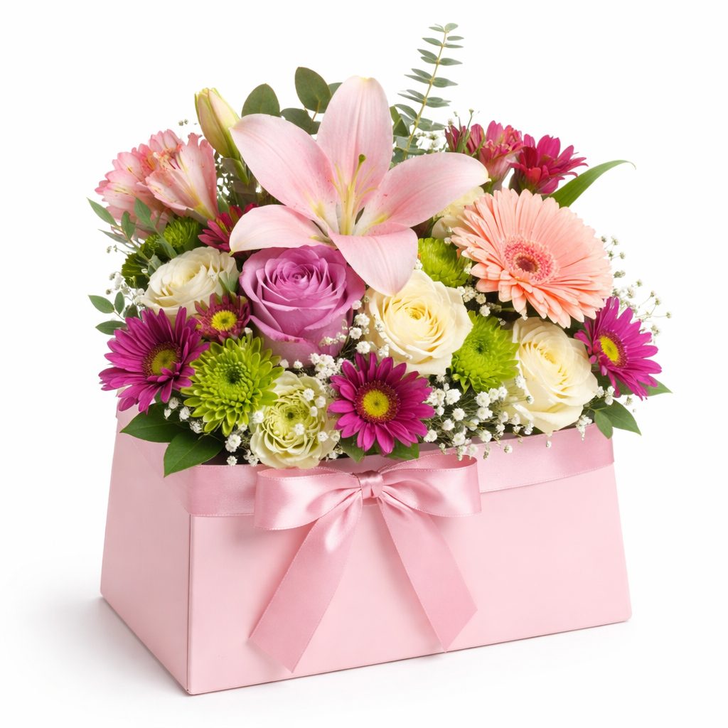 Розовые лилии и герберы, сиреневые и белые розы, а также кустовые хризантемы создают гармоничную композицию. Корзина выполнена в нежно-розовом цвете, добавляя изысканности. Альтернативно можно оформить в корзине из ротанга или с тканевой отделкой. Отличный подарок для любимой на годовщину или день рождения.